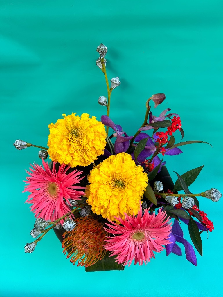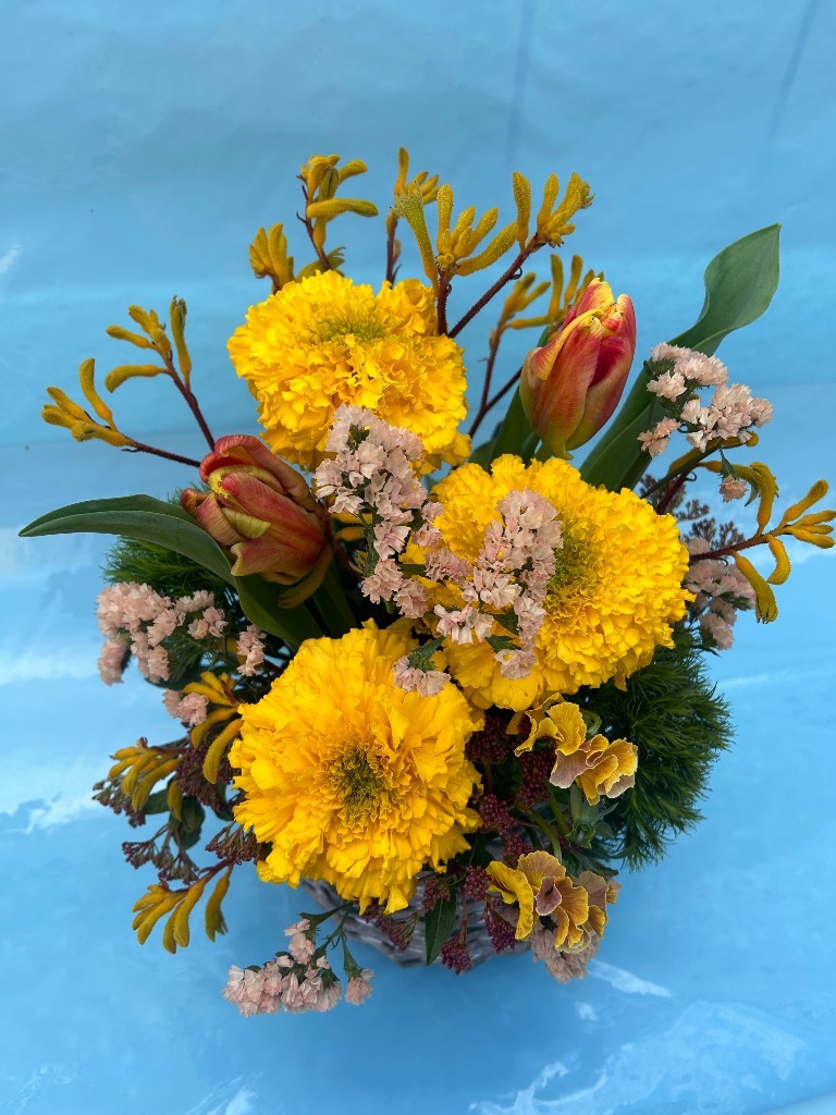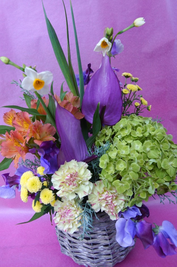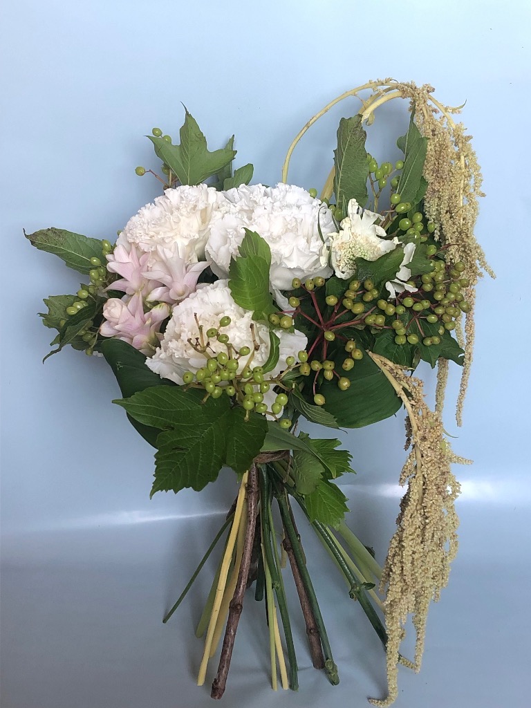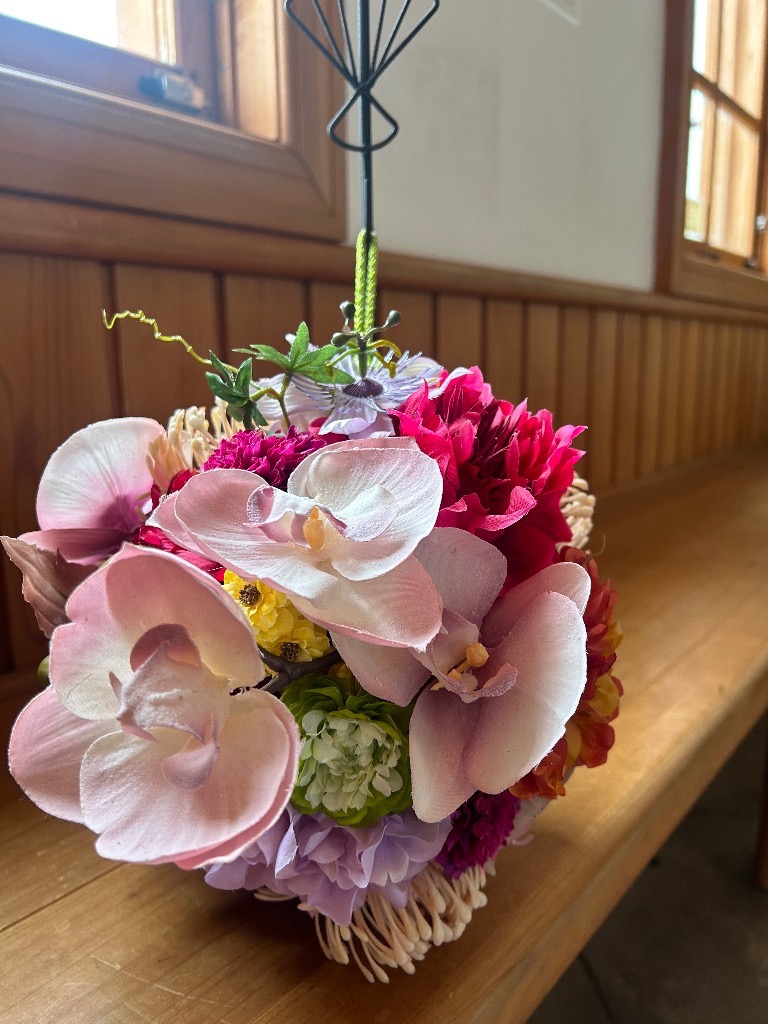 お花を吸水性のスポンジに挿してお作りするものです。花束と違い、花器をご用意していただく必要がなく、そのまま飾っていただけます!