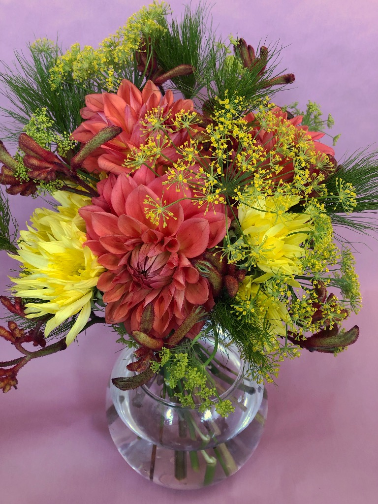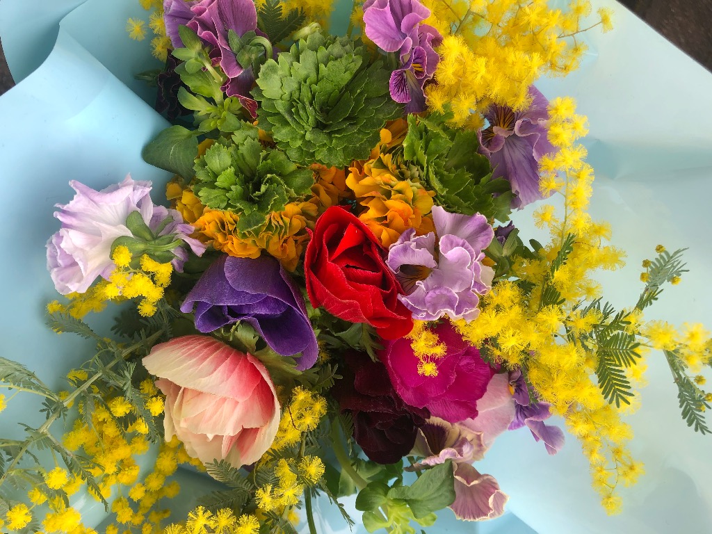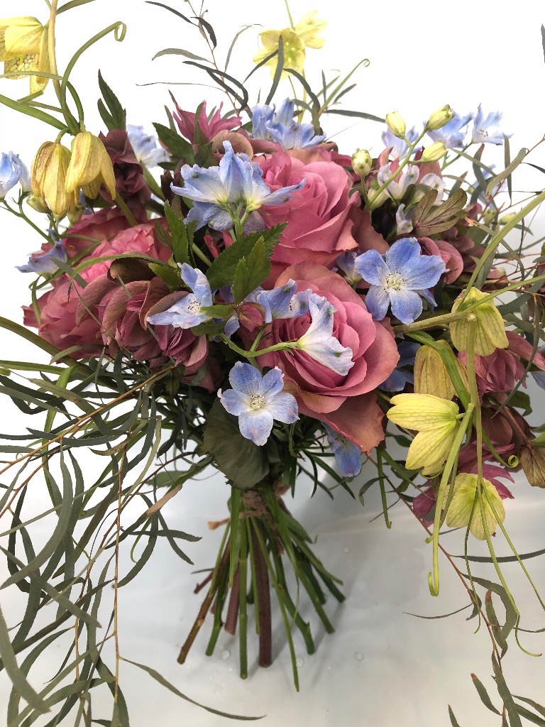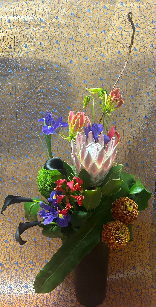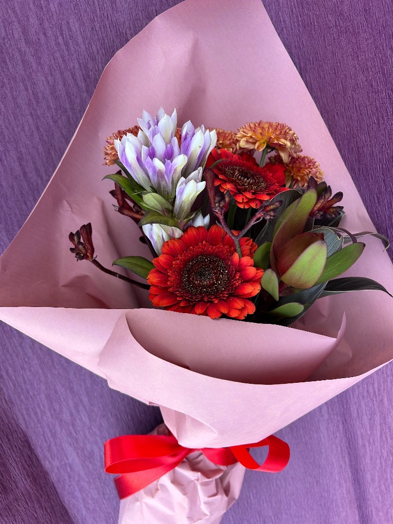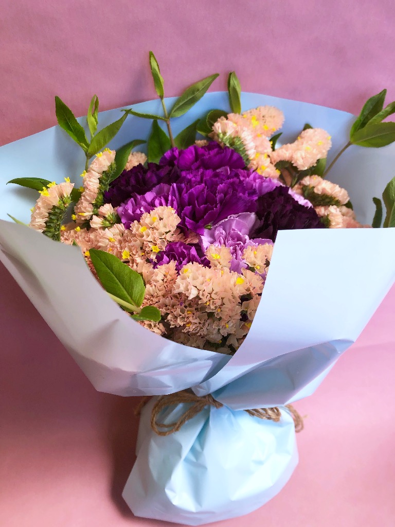 お花をスパイラル状に組んでラッピングいたします。飾る時はラッピングを外し、水をはった器に生けてあげてください。